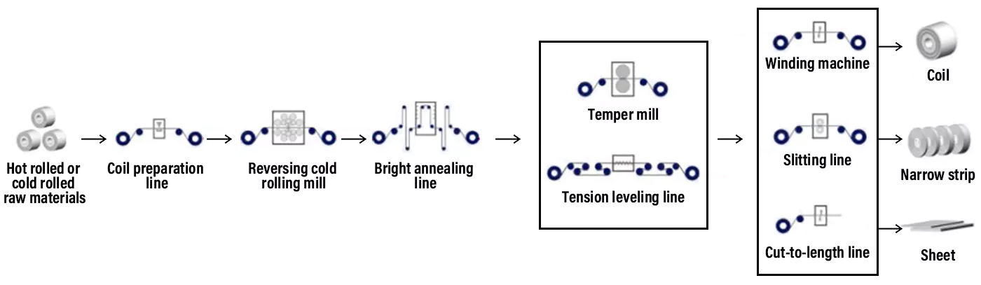 In this process flow, the hot-rolled or cold-rolled stainless steel raw materials are rolled to the target thickness by a high-precision reversing multi-high cold rolling mill at ambient temperature, and the bright heat treatment is carried out to have the surface effect and mechanical properties required by customers, and then the process of tempering or tension leveling is carried out to optimize the surface and shape of the stainless steel sheet and strip, and the products’ mechanical properties are improved to achieve the mechanical properties required by the precision cold-rolled stainless steel sheet and strip; the precision cold-rolled stainless steel sheet and strip produced through this process flow is soft in terms of mechanical properties.